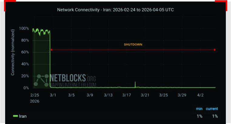 MIDDLE EAST, April 5, 2026 (NPA) — Iran’s internet blackout has become the longest nation-scale shutdown ever recorded, now in its 37th consecutive day after 864 hours, according to NetBlocks. The disruption has triggered severe social and economic consequences, cutting off communication among citizens, families, and communities, while blocking access to vital information and limiting the ability to organize or express dissent.