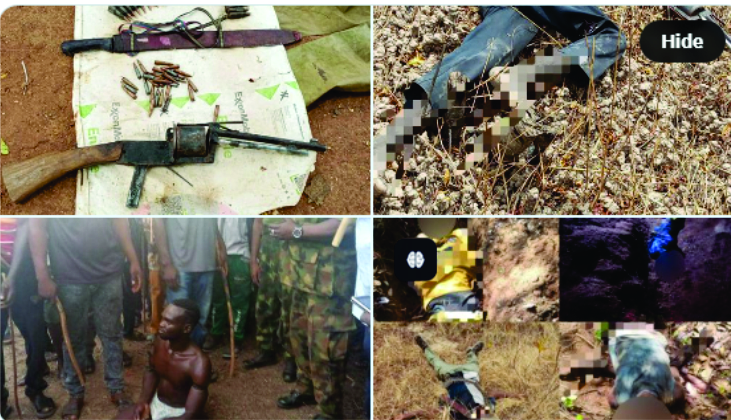 During a firefight along the Babangida–Adua road, soldiers neutralized two suspects while others fled with gunshot wounds. A search of the area led to the recovery of arms and ammunition, including a locally fabricated firearm, 105 rounds of 7.62mm PKT ammunition, 30 rounds of 7.62mm special ammunition, and a cutlass.