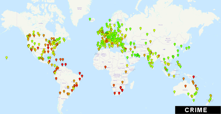North African cities appeared relatively lower on the index, with Casablanca at 55.4, Cairo at 49.8, and Algiers at 50.8, suggesting comparatively moderate crime perception levels.