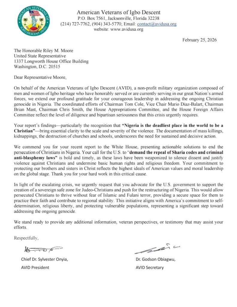 In a letter dated February 25, 2026, and signed by AVID President Chief Dr. Sylvester Onyia, the group argued that such a measure would enable persecuted Christians to live and worship freely, shielded from extremist violence. “This initiative aligns with America’s commitment to self-determination, religious liberty, and protecting vulnerable populations, representing a significant step toward addressing the ongoing genocide,” the letter stated.